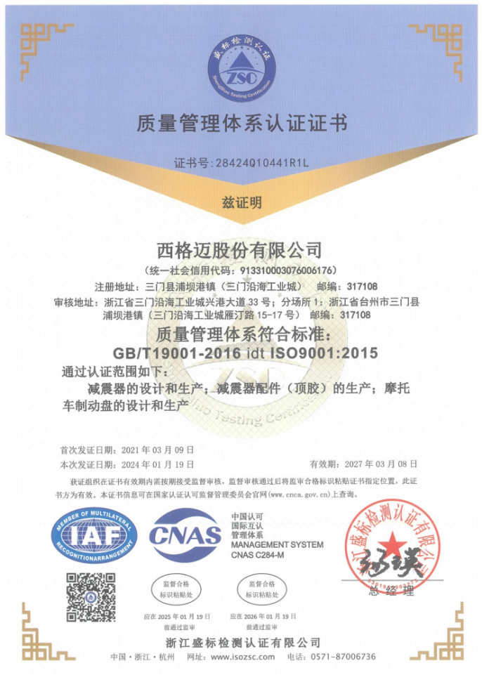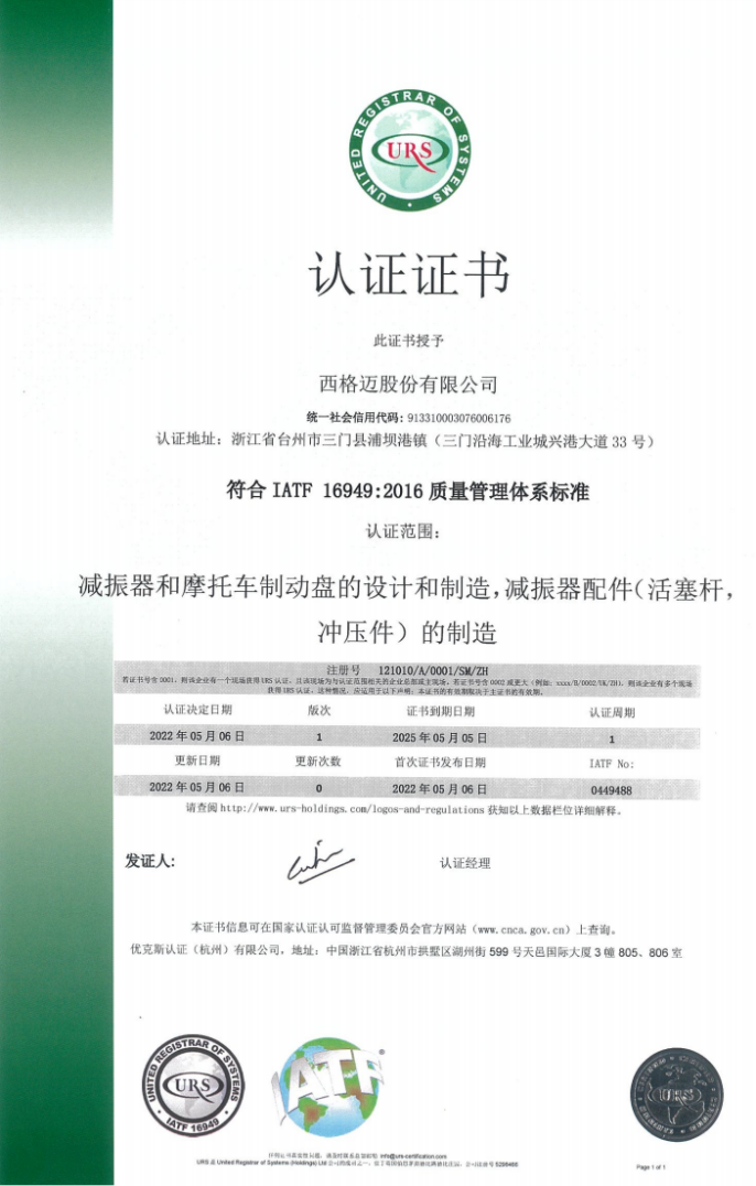 西格迈股份有限公司是汽车减振器设计与制造企业,年产值超过20亿,产量超过2000万只减振器,拥有专业减振器设计研发团队,设计团队由国内外知名专家组成,并聘请了多名知名大学教授设计指导,与清华大学等高校联合开发减振器相关产品,同时公司与美国GRC减振器公司合作,能准确地把握减振器国内外市场的发展趋势和设计思路,并能将其熟练应用至实际产品设计过程中。西格迈具有完整的减振器正向/逆向开发能力。在产品设计过程中,严格遵循IATF标准和客户要求中的APQP五格阶段进行设计开发。公司具有MTS,产品扫描,产品造型等产品设计辅助设备,成功开发了多家主机厂减振器业务